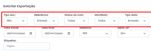 No campo “Tipo doc.”, escolha o tipo de nota que deseja exportar: